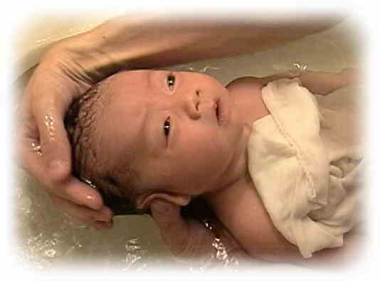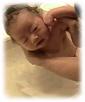 3)さあ、入浴です。まずは足からゆっくりとつけます。少々泣いていても体を