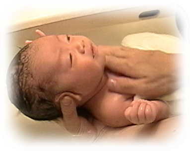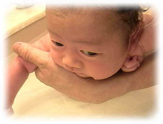 乗せます。この時、首が締まったり、顔がお湯につからないように気をつけます。