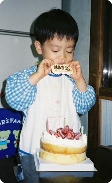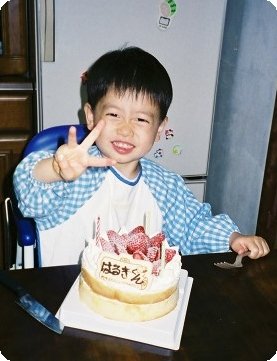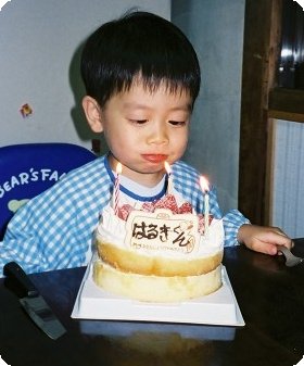 3歳なのでろうそくは3本! ちゃ〜んと指で「3つ」が出来ました(^_^;)