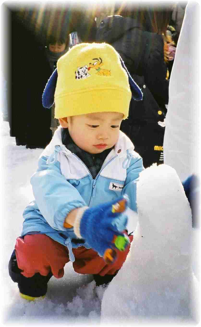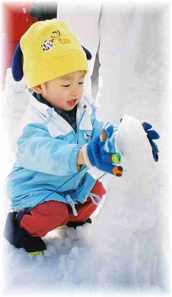 生まれて初めての雪。 手袋を外して触らせて見ると 「冷たいねぇ」 (注 讃岐弁のイントネーションで) とのご感想でした(^_^;)